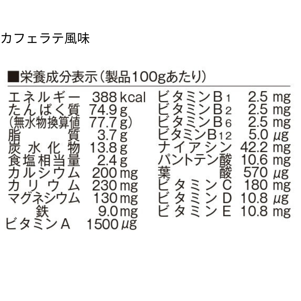 粉末状大豆たんぱく(大豆を含む)(国内製造)、ぶどう糖、マルトデキストリン、インスタントコーヒー/香料、乳化剤(乳由来)、甘味料(ステビア、スクラロース、アセスルファムK)、V.C、ナイアシン、V.E、パントテン酸Ca、V.B2、V.B6、V.A、V.B1、葉酸、V.D、V.B12