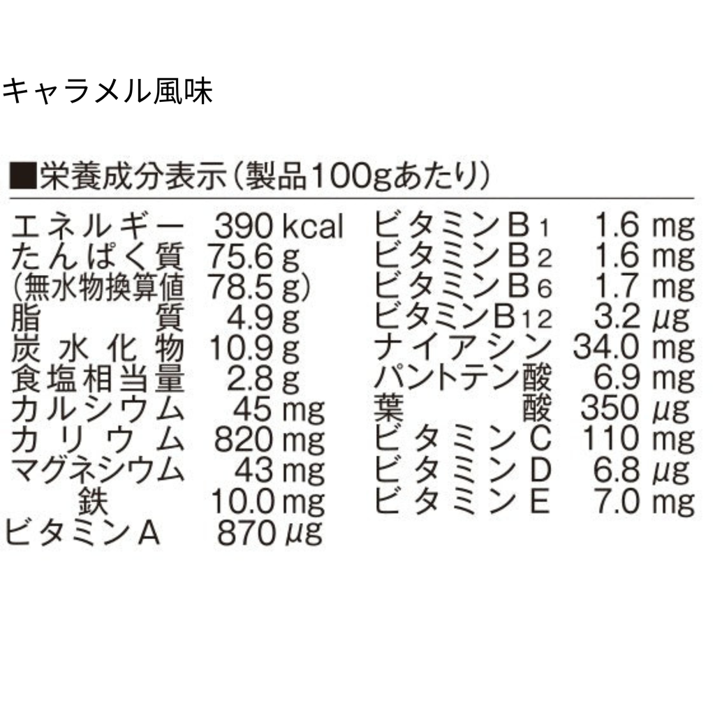 大豆たんぱく(中国製造)、デキストリン、クリーミングパウダー、食塩/香料、甘味料(スクラロース、アセスルファムK)、カラメル色素、V.C、乳化剤、抽出V.E、ナイアシン、V.E、パントテン酸Ca、V.B1、V.B6、V.B2、V.A、葉酸、V.D、V.B12(一部に乳成分、大豆を含む)
